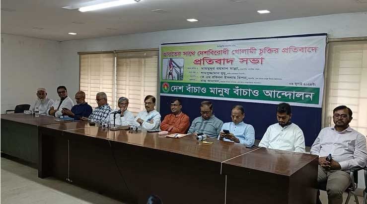 মঙ্গলবার জাতীয় প্রেসক্লাবের মাওলানা মোহাম্মদ আকরম খাঁ হলে দেশ বাঁচাও মানুষ বাঁচাও আন্দোলনের উদ্যোগে ভারতের সাথে দেশবিরোধী গোলামী চুক্তির প্রতিবাদে এক আলোচনা সভায় এসব কথা বলেন বক্তারা।