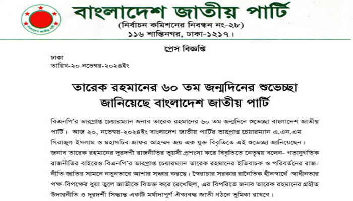 তারেক রহমানের ৬০ তম জন্মদিনে বাংলাদেশ জাতীয় পার্টি’র শুভেচ্ছা