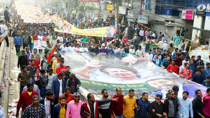 এদিকে বেলা সোয়া ২টার দিকে শুরু হয় র্যালি। শান্তিনগর ঘুরে বিকাল সাড়ে ৩টার দিকে নয়াপল্টনে দলীয় কার্যালয়ের সামনে গিয়ে এটি শেষ হয়। বিজয় দিবসে অন্যান্য বছরের মতো ঢাক-ঢোল, ঘোড়ার গাড়ি, সাউন্ড আর বাঁশির ভেপু নিয়ে আনন্দের পরিবর্তে এবার নেতাকর্মীদের চোখেমুখে ছিল উদ্বেগ-উৎকণ্ঠা আর ক্ষোভ। এদিন তারা দেশের গণতন্ত্র আর ভোটাধিকার ফিরিয়ে আনার যেমন স্লোগান দিয়েছেন, তেমনি ‘একতরফা’ নির্বাচন আয়োজন বাতিলেরও দাবি জানিয়েছেন।
