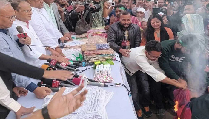 বৃহস্পতিবার জাতীয় প্রেস ক্লাবের সামনে ‘দেশীয় পণ্য, কিনে হও ধন্য’ শিরোনামে একটি সভায় ভারতীয় শাড়ি ছুড়ে ফেলেন তিনি। এরপর সেখানে উপস্থিত নেতাকর্মীদের শাড়িটিতে আগুন ধরিয়ে দিতে নির্দেশ দেন। তার নির্দেশে সেটিতে আগুন ধরিয়ে পুড়িয়ে ফেলেন নেতাকর্মীরা।